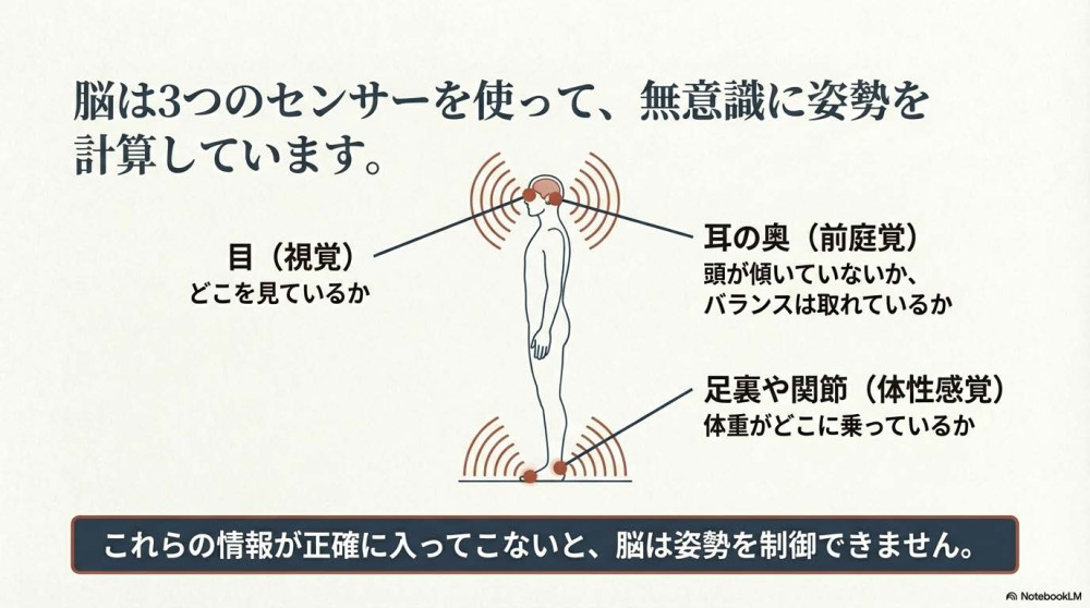 脳は常に、目・耳のバランス・首の位置・足裏や関節の感覚を統合して、身体を微調整している。この情報がどこかでズレると、脳は全体のバランスを守るために代償動作を選ぶ。その代償が猫背として現れる。