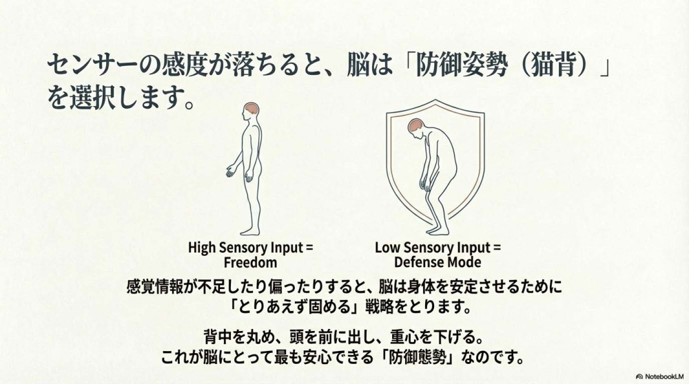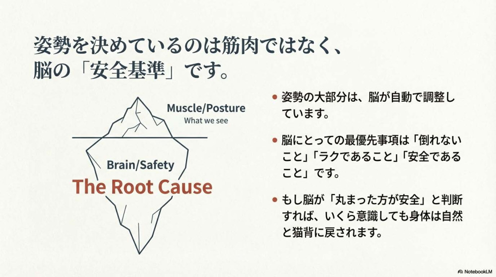 この3つが揃うと、脳は「丸めた方が安全」と判断する。つまり猫背は、怠けでも姿勢が悪いだけでもなく、脳が条件反射的に選んでいる守りの姿勢なのだ。