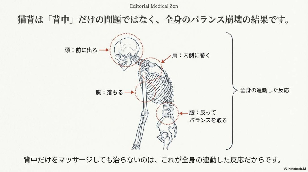 一般的な整体やマッサージでは、猫背の人に対して背中や肩甲骨まわりを揉むことが多い。これはこれで必要だし、その場では楽になる。ただ、これだけだと「筋肉のコリをほぐした」だけで終わる。