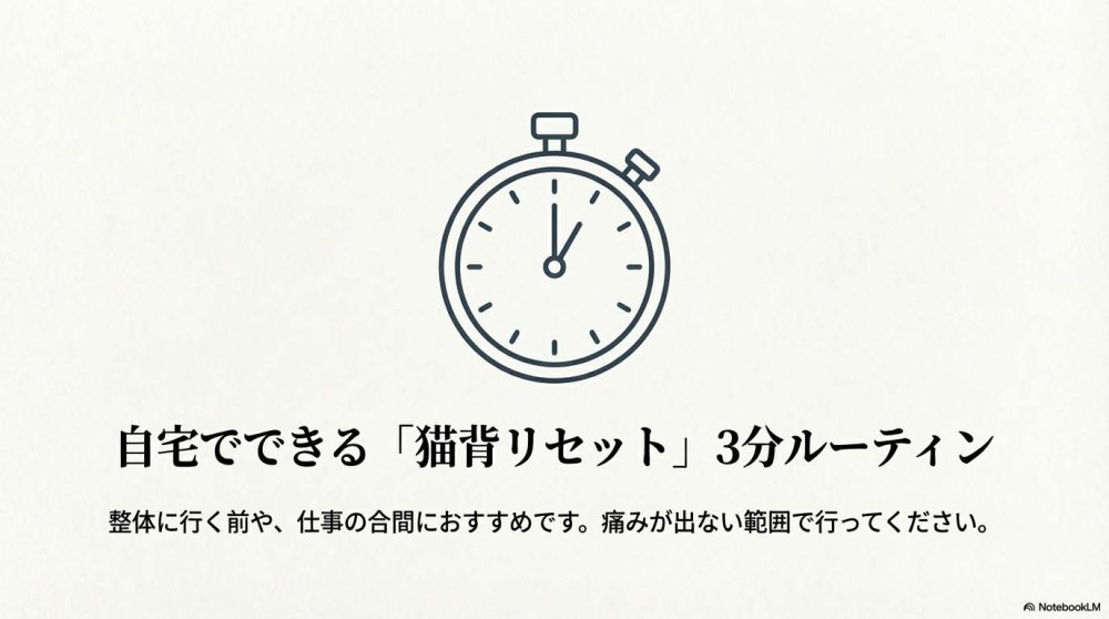 整体に行く前でも後でも使える、猫背リセットの3分ルーティンを紹介する。