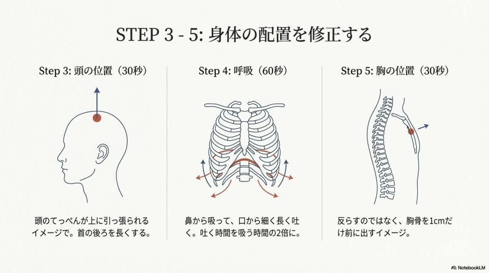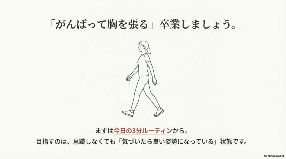 まずは今日紹介した3分ルーティンを試してみてほしい。そして「頑張って胸を張る」ではなく「気づいたら戻っている」状態を目指す。それが猫背攻略の本筋だ。