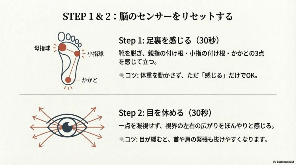 次に視覚をソフトにする。一点をガン見せず、正面を見つつ周辺視野もぼんやり使う。目がラクになったらOK。
