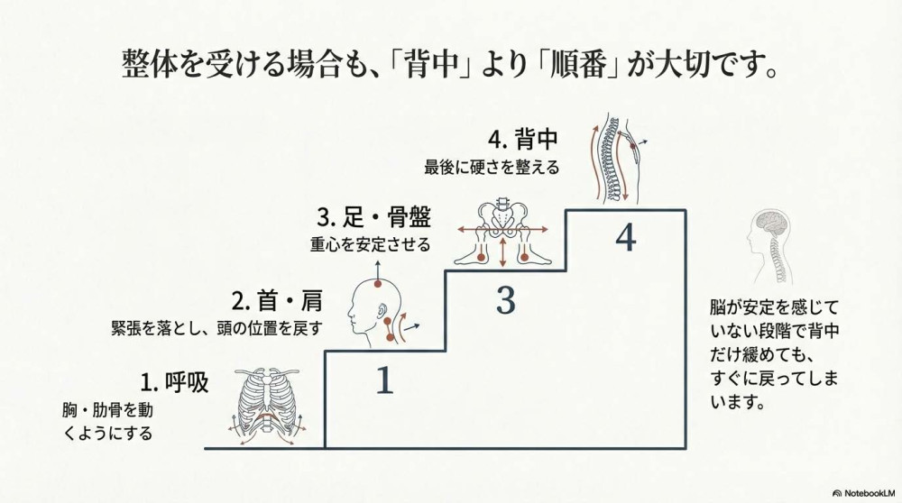 そのためには、視覚・呼吸・足裏感覚といった「脳に入力される情報」を整える整体を選ぶといい。筋肉や骨格ももちろん大事だが、そこだけだと脳の設定が変わらず同じ姿勢に戻りやすい。