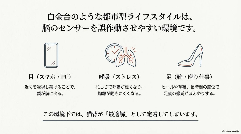 白金台のオフィス街を歩いていると、スマホを見ながら背中を丸めて歩く人をよく見かける。カフェでPC作業している人も、気づいたら画面に顔が近づいている。そして多くの人が「猫背を直したい」と整体院を探している。