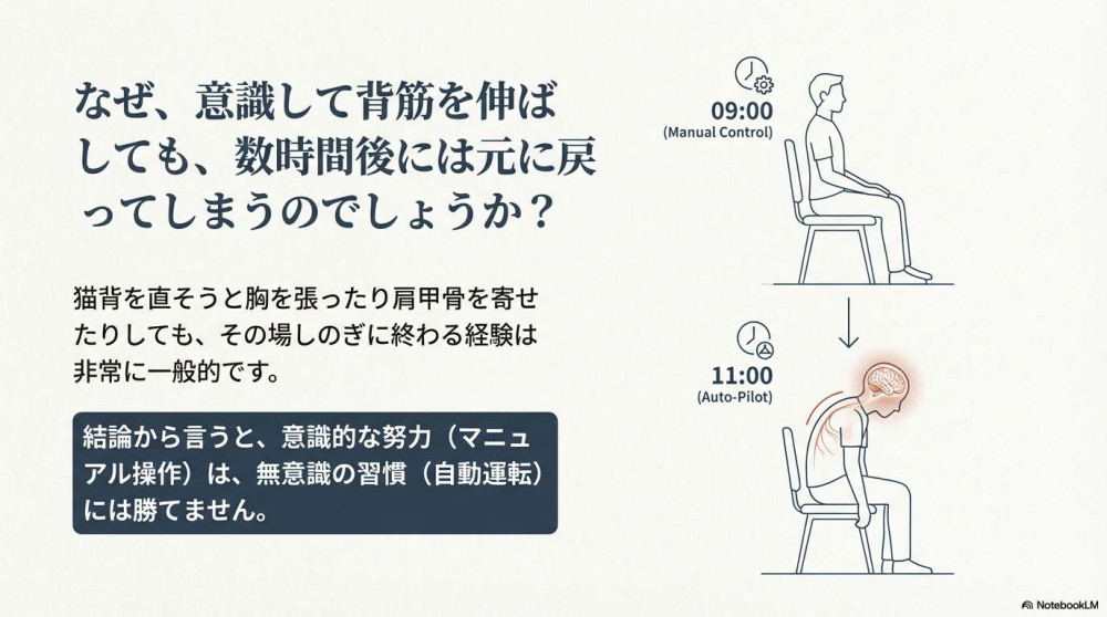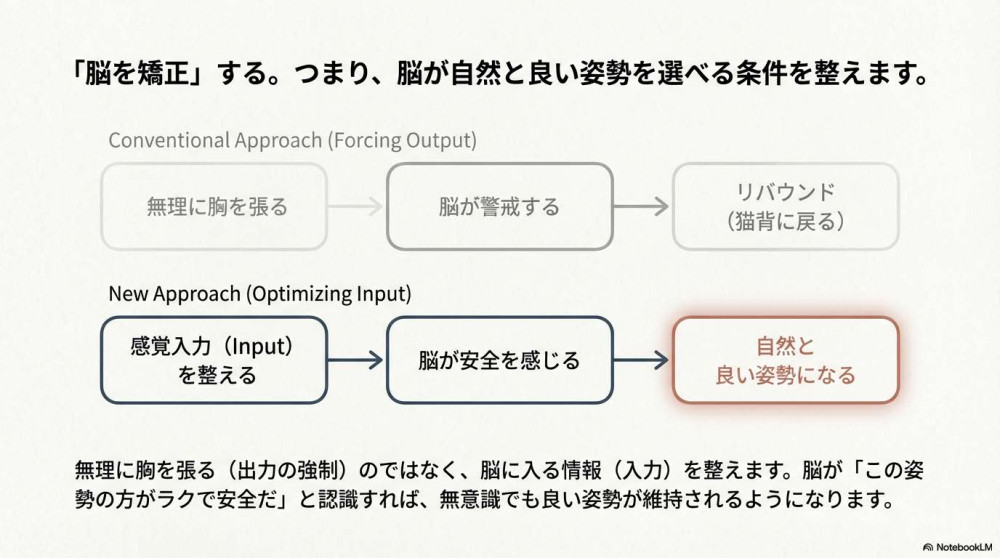 整体で猫背を根本から変えるには、筋肉をほぐすだけではなく「脳の姿勢制御システムを再学習させる」アプローチが必要になる。